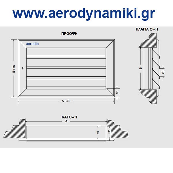 Περσίδα βροχής-νωπού για τοποθέτηση σε εξωτερικό τοίχο από ανοδιωμένο αλουμίνιο με σταθερά πτερύγια κλίσης 45ο με πλέγμα γαλβανισμένο (6X6 mm) στο πίσω μέρος που εμποδίζει την είσοδο ξένων σωμάτων. Κατάλληλo για τη λήψη ή την απόρριψη αέρος από ή σε εξωτερικούς χώρους. Τα πτερύγια είναι παράλληλα στην πρώτη αναφερόμενη διάσταση.