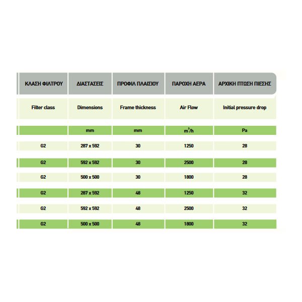 Φίλτρα λίπους συρμάτινα με πλεγμα αλουμινίου. ΔΙΑΣΤΑΣΕΙΣ 500 Χ 500 Χ 48 Υλικό κατασκευής Ανοξείδωτο πλαίσιο πάχους 0.6mm και πλέγμα αλουμινίου. Κατάλληλα για: Απορροφητήρες κουζινών για την συγκράτηση του λίπους Πρόφιλτρα σε συστοιχίες φίλτρων ενεργού άνθρακα Συγκράτηση υγρασίας και λαδιών Συγκράτηση άμμου Κλιματιστικές μονάδες Κατασκευάζονται σε οποιαδήποτε διάσταση Κατασκευάζονται σε όλα τα προφίλ Wire grease filters with aluminium braiding. DIMENSIONS 500 X 500 X 48 Construction material Stainless steel frame 0.6mm thick and aluminium mesh. Suitable for: Kitchen sinks for the retention of fat Profiles in activated carbon filter arrays Moisture and oil retention Sand retention Air conditioning units Manufactured in any dimension Manufactured in all profiles