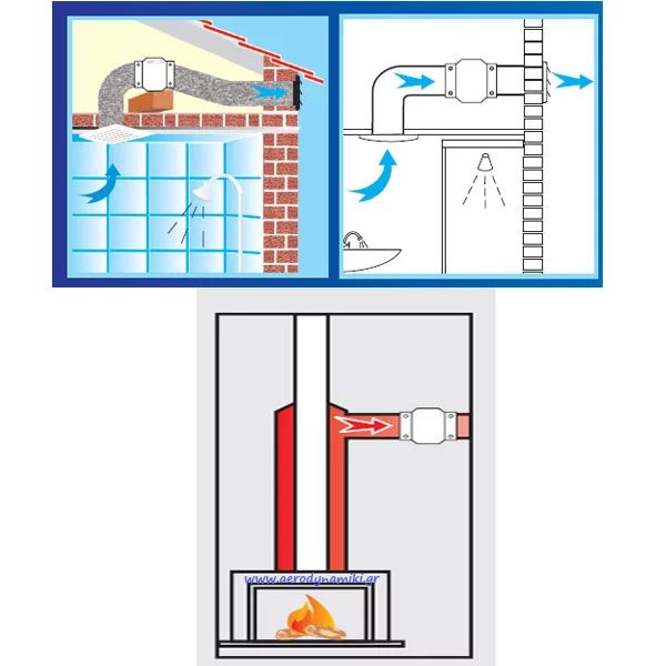 Ανεμιστήρας υψηλής θερμοκρασίας κατάλληλος για μεταφορά του ζεστού αέρα απο το τζάκι. Απορροφητήρας μεταφοράς θερμού αέρα για τζάκια. Τοποθετείται ανάμεσα σε αεραγωγούς ή σπιράλ για απομακρυσμένα δωμάτια. BOK-120 Φ 120 240 m3/h 46 w 2650 rpm ( Στροφές ) Εξαεριστήρας ενδιάμεσος IN LINE Εξαεριστήρας αγωγού υψηλών θερμοκρασιών Long life In-line axial fans Διάμετρος : Φ120mm Ισχύς: 46W Περιστροφή κινητήρα: 2650rpm Ροή αέρα: 240m³/h Τάση: 230V 50Hz Τοποθέτηση σε σωλήνα εσωτερικά ή ενδιάμεσα σε 2 σωλήνες Υλικό κατασκευής : μεταλλικό Βαθμός στεγανότητας: IP44 Εγγύηση: 2 χρόνια High temperature fan suitable for transporting hot air from the fireplace. Hot air transfer hood for fireplaces. It is placed between air ducts or spirals for remote rooms. BOK-120 Φ 120 240 m3/h 46 w 2650 rpm ( Speeds ) Intermediate IN LINE ventilator Ventilator for high-temperature ducts Long-life In-line axial fans Diameter: Φ120mm Power: 46W Motor rotation: 2650rpm Airflow: 240m³/h Voltage: 230V 50Hz Installation inside or in-between 2 ducts Construction material: Metal Waterproof rating: IP44 Warranty: 2 years