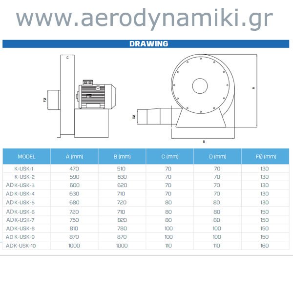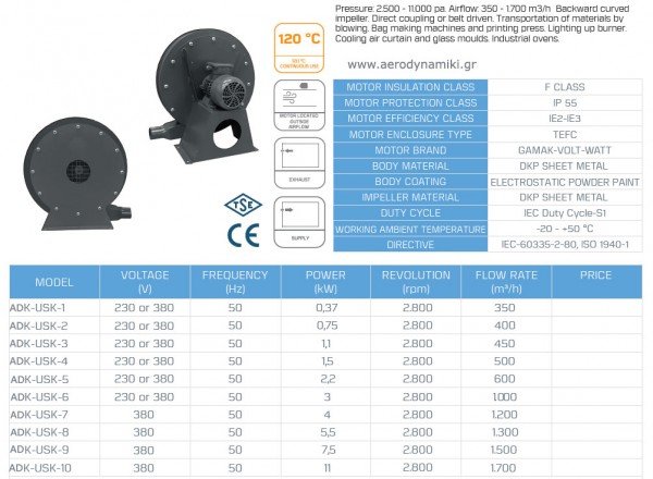 Απορροφητήρες υψηλής πίεσης ADCOUSK Ανεμιστήρας υψηλής πίεσης με φτερωτή οπισθοκλινή Από 950 Μ3/Η 0.37 KW ΕΩΣ 6000 M3/H 11 kw Απορροφητήρες. Κατάλληλοι για βιομηχανική χρήση σε συστήματα απορρόφησης,μεταφορά σκόνης μαρμάρου, πλαστικών, φούρνους,ξηραντήρια κ.λ.π. Για οποιαδήποτε πληροφορία παρακαλώ επικοινωνήστε μαζί μας. ADCOUSK high pressure absorbers High pressure fan with rear wing From 950 M3/H 0.37 KW TO 6000 M3/H 11 kw Absorbers. Suitable for industrial use in absorption systems, transport of marble dust, plastics, ovens, dryers, etc. For any information please contact us.