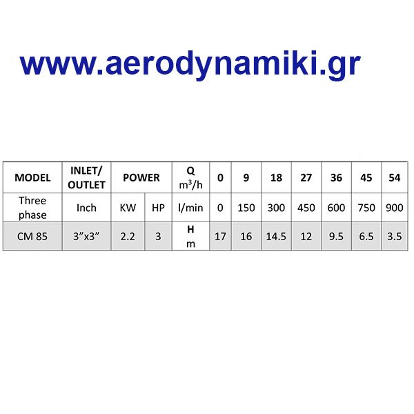Αντλία νερού Τεχνικά Χαρακτηριστικά Ισχυς: 3 Hp Ταση: 380V Τριφασική Μεγιστο μανομετρικο: 17m Μεγιστη παροχη: 54 m3/h Παροχές στομίων: 3x3 Σώμα Αντλίας: χυτοσίδηρος Φτερωτή: ορείχαλκος Technical Specifications Power: 3 Hp Voltage: 380V Three-phase Maximum head: 17m Maximum flow rate: 54 m3/h Nozzle connections: 3x3 Pump Body: Cast iron Impeller: Brass