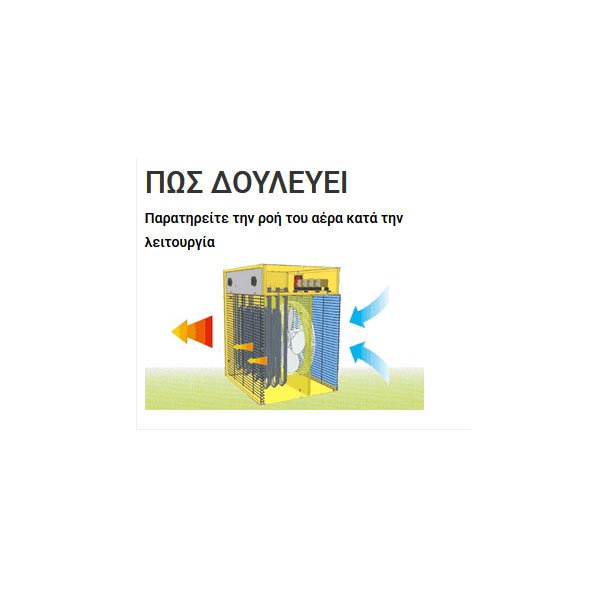 ΗΛΕΚΤΡΙΚΟ ΑΕΡΟΘΕΡΜΟ Κατάλληλο για καφέ, μπάρ, εστιατόρια, ταβέρνες και σε χώρους κλειστούς με νάυλον και τζαμαρίες. Δυνατότητα σύνδεσης με εύκαμπτο σωλήνα θερμού αέρα Δυνατότητα σύνδεσης με θερμοστάτη χώρου Χωρίς κατανάλωση οξυγόνου Χωρίς καπνούς, χωρίς μυρωδιές, χωρίς υγρασία Χαμηλή στάθμη θορύβου Χειροκίνητη επαναφορά 100% Απόδοση Μοτέρ με θερμική προστασία Θερμαντικά στοιχεία από ανοξείδωτο χάλυβα Προστασία υπερθέρμανσης Δυνατότητα ρύθμισης της θερμοκρασίας του θερμού αέρα Βαριά και μακράς διαρκείας κατασκευή Ισχύς:1,65 / 3,3 kW 5.630 / 11.260 Btu/h 1.430 / 2.860 Kcal/h Παροχή αέρα: 510 m3/h Διαστάσεις l x w x ht 280 x 270 x 420 mm Παροχή Ρεύματος: 230/50 V/Hz 14,5 A Διακόπτης θέση 1- OF Διακόπτης θέση 2- Ανεμιστήρας Διακόπτης θέση 3- 1,65 KW Διακόπτης θέση 4- 3,3 KW Καθαρό / Μικτό βάρος: 5,1 / 5,6 kg Έλεγχος με θερμοστάτη: ενσωματωμένος Δείκτης Αντοχής:IPX4 ELECTRIC AIR HEATER Suitable for cafes, bars, restaurants, taverns and in enclosed areas with nylon and glass windows. Possibility of connection with hot air hose Possibility of connection with room thermostat Without oxygen consumption No fumes, no smells, no moisture Low noise level Manual reset 100% Performance Motor with thermal protection Stainless steel heating elements Overheating protection Possibility to adjust the temperature of the hot air Heavy and long-lasting construction Power:1,65 / 3,3 kW 5.630 / 11,260 Btu/h 1.430 / 2.860 Kcal/h Air supply: 510 m3/h Dimensions l x w x h 280 x 270 x 420 mm Power supply: 230/50 V/Hz 14,5 A Switch position 1- OF Position switch 2- Fan Position switch 3- 1,65 KW Switch position 4- 3,3 KW Net / Gross weight: 5.1 / 5.6 kg Control with thermostat: built-in Resistance index:IPX4