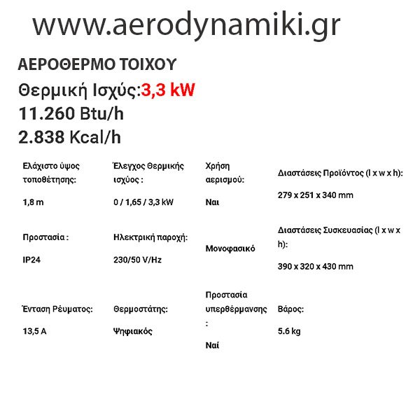Ηλεκτρικό αερόθερμο τοίχου 3,3 kw Επιτοίχια τοποθέτηση Ρυθμιζόμενη θερμότητα Περιλαμβάνει Ψηφιακό θερμοστάτη με χρονοπρογράμματα Ο ψηφιακός απομακρυσμένος χρονοθερμοστάτης επιτρέπει τη ρύθμιση την επιθυμητή θερμοκρασία και τους χρόνους εργασίας και επιλέξτε μεταξύ μόνο με πλήρη ισχύ, μεσαία ισχύ ή εξαερισμό Ενσωματωμένος θερμοστάτης υπερθέρμανσης Χαμηλός θόρυβος Χωρίς κατανάλωση οξυγόνου Χωρίς αναθυμιάσεις, οσμές, υγρασία Τηλεχειριστήριο Εύκολη εγκατάσταση Το τηλεχειριστήριο είναι προ-ενσύρματο και περιλαμβάνει θερμοστάτη, ρύθμιση και βραχίονα τοίχου Ο βραχίονας τοίχου που περιλαμβάνεται στο κουτί επιτρέπει να κατευθύνει το TR στις 45 °Γρήγορη θέρμανση για καταστήματα, αίθουσες, εκθεσιακούς χώρους, αίθουσες συσκέψεων, μπανγκαλόου, γραφεία, εργαστήρια, γκαράζ, αίθουσες υποδοχής, μεγάλες σκηνές, κελάρια Electric wall air heater 3,3 kw Wall mounting Adjustable heat Includes Digital thermostat with time schedules The digital remote timer allows setting the desired temperature and working times and choose between full power only, medium power or ventilation Built-in overheating thermostat Low noise Without oxygen consumption No fumes, no odours, no moisture Remote control Easy installation The remote control is pre-wired and includes thermostat, regulation and wall bracket The wall bracket included in the box allows to direct the TR at 45° Quick heating for shops, halls, showrooms, conference rooms, meeting rooms, bungalows, offices, workshops, garages, reception rooms, large tents, cellars