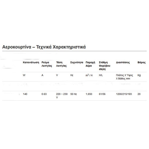Αεροκουρτίνα 1200X215X193 - 140 W - 1650 m3/h - 56 db - 20 Kg Οι αεροκουρτίνες αποτελούν μία απλή και αξιόπιστη λύση για την κάλυψη απλών επαγγελματικών αναγκών. Αεροκουρτίνα κατάλληλη για βιομηχανικούς χώρους, εστιατόρια επαγγελματικές κουζίνες, ψησταριές, καφέ, ζαχαροπλαστεία, μπάρ, εμπορικά μαγαζιά κ.λ.π. Εξοικονόμηση ενέργειας Εμπόδιο για έντομα, σκόνη, οσμές, ρύπους, και υγρασία. Εύκολη εγκατάσταση. Διαθέτουν τηλεχειρισμό και αντισκωριακή προστασία, αφού είναι κατασκευασμένες από γαλβανισμένη λαμαρίνα και βαμμένες με αντισκωριακή βαφή. Περαιτέρω χαρακτηριστικά είναι η χαμηλή στάθμη θορύβου, η υψηλή παροχή αέρα εξόδου, η νέου τύπου διαμήκης φτερωτή και οι κινητήρες υψηλής ποιότητας και διάρκειας ζωής. Οι αεροκουρτίνες αποτελούν μία απλή και αξιόπιστη λύση για την κάλυψη απλών επαγγελματικών αναγκών. Το 100% των βασικών εξαρτημάτων ελέγχεται εργαστηριακά πριν τη συναρμολόγηση, ενώ επενδύονται σημαντικά κονδύλια στα συστήματα ποιοτικού ελέγχου της παραγωγής με διεθνή αναγνώριση. Air curtain 1200X215X193 - 140 W - 1650 m3/h - 56 db - 20 Kg Air curtains provide a simple and reliable solution for covering basic commercial needs. Suitable for industrial spaces, professional kitchens, grills, cafes, bakeries, bars, shops, etc. Energy-saving. Barrier against insects, dust, odors, pollutants, and humidity. Easy installation. Equipped with remote control and corrosion protection, as they are made of galvanized sheet metal and painted with anti-corrosive paint. Further features include low noise level, high air output, new type of axial fan, and high-quality, long-lasting motors. Air curtains provide a simple and reliable solution for covering basic commercial needs. 100% of the basic components are laboratory tested before assembly, while significant investments are made in production quality control systems with international recognition.