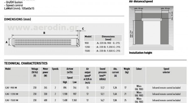 ΑΕΡΟΚΟΥΡΤΙΝΕΣ ΔΙΑΣΤΑΣΕΙΣ 900Χ220Χ215 2 ταχ 744-856 M3/H 51,7 DB Υψηλής ποιότητας, εξαιρετικά λεπτού και καλαίσθητου προφίλ Κατακευασμένη εξ ολοκλήρου από ατσάλι, φινιρισμένη με διακριτικό αντιοξειδωτικό χρώμα Αθόρυβης λειτουργίας που οφείλεται στη μοναδική συνεργασία μοτέρ και φτερωτής Όλα τα μοντέλα συνεργάζονται με θερμικό προστασίας Εύκολη εγκατάσταση Για ύψος πόρτας έως 3m Με ασύρματο χειρηστήριο ΕΦΑΡΜΟΓΕΣ σε καταστήματα,καφέ μπάρ,εμπορικά κέντρα και χώρους εστίασης. Air Curtains Dimensions: 900x220x215, 2 speeds, 744-856 M3/H, 51.7 dB High-quality, exceptionally thin and aesthetically pleasing profile Constructed entirely from steel, finished with discreet anti-corrosive color Quiet operation due to the unique collaboration of the motor and impeller All models are equipped with thermal protection Easy installation For door heights up to 3m With wireless remote control Applications: suitable for stores, cafes, bars, shopping centers, and dining areas.