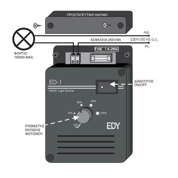 Ρυθμιστής στροφών κινητήρων εξαερισμού Dimmer. 230V, έως 2500 W, με προ ρύθμιση ελάχιστων στροφών. Σύνδεση χωρίς ουδέτερο. Ροοστάτης για μοτέρ. Η συσκευή ED-3 είναι επιτοίχιος ρυθμιστής τάσης (dimmer) 230V a.c./50Hz, για τον έλεγχο ασύγχρονων μονοφασικών κινητήρων, που λειτουργούν σε εύρος περίπου 50-100% των ονομαστικών στροφών, όπως συμβαίνει με τους κινητήρες στις εγκαταστάσεις εξαερισμού.Γι’ αυτό είναι απαραίτητος ο έλεγχος των χαμηλότερων στροφών του ηλεκτρικού κινητήρα, για να αποφύγουμε την υπερθέρμανσή του και συνεπώς την καταστροφή του. Διαθέτει για τον χειρισμό του ένα ποτενσιόμετρο, για την ρύθμιση των στροφών στο επιθυμητό σημείο του χρήστη, από ένα κατώτερο προ ρυθμιζόμενο όριο, έως το μέγιστο. Το κατώτερο όριο στροφών ρυθμίζεται με το trimer που διαθέτει η συσκευή, ως εξής: Με το κουμπί ρύθμισης στροφών γυρισμένο στο ελάχιστο, ρυθμίζουμε με τη βοήθεια ενός μικρού κατσαβιδιού το τρίμμερ ελάχιστων στροφών, γυρίζοντας το δεξιά, τόσο ώστε ο κινητήρας να περιστρέφεται ικανοποιητικά, χωρίς να έχει πρόβλημα στην εκκίνηση. Τώρα το dimmer ρυθμίζει τις στροφές του κινητήρα από το κατώτερο όριο στροφών έως το μέγιστο. Επίσης η συσκευή διαθέτει και ένα διακόπτη ON OFF, για την ενεργοποίηση και απενεργοποίηση του φορτίου. Τάση λειτουργίας 230V AC 50Hz Iσχύς έως 2500W Προστασία από βραχυκύκλωμα/υπερφόρτωση FUSE TUBE 5.2x20mm 12A/250V Θερμοκρασία λειτουργίας – 10 οC έως +60 οC Μέγιστη υγρασία 95% Υλικό κατασκευής Πλαστικό ABS Διαστάσεις 120mm x 85mm x 35mm ΠΡΟΣΟΧΗ: Ο διακόπτης δεν απομονώνει τη γραμμή ισχύος, αλλά μόνο το κύκλωμα οδήγησης. Dimmer ventilation motor drive. 230V, up to 2500 W, with minimum speed preset. Connection without neutral. Dimmable for motor. The ED-3 device is a 230V a.c./50Hz wall dimmer for the control of asynchronous single-phase motors, operating in a range of about 50-100% of rated speed, as is the case with motors in ventilation installations. It has a potentiometer for its operation, to adjust the speed at the desired point of the user, from a lower pre adjustable limit, to the maximum. The lower speed limit shall be adjusted with the trimer provided by the device, as follows: With the speed knob turned to a minimum, use a small screwdriver to adjust the minimum speed trimmer, turning it right, so that the engine rotates satisfactorily without having problems starting. Now the dimmer adjusts engine speed from the lower speed limit to the maximum. The device also has an ON OFF switch to turn the load on and off. Operating voltage 230V AC 50Hz Power up to 2500W Short circuit/overload protection FUSE TUBE 5.2x20mm 12A/250V Operating temperature – 10 οC to +60 οC Maximum humidity 95% Material: ABS plastic Dimensions: 120mm x 85mm x 35mm CAUTION: The switch does not isolate the power line, but only the driving circuit.