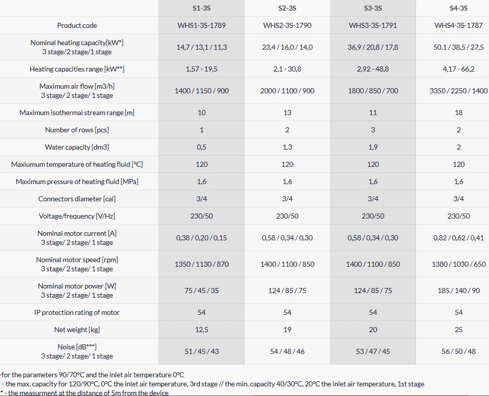 Αερόθερμο νερού 23,4 κw είναι σχεδιασμένο για τη θέρμανση βιομηχανικών αιθουσών, αποθηκών, συνεργείων, logistics centers, θερμοκηπίων και επαγγελματικών χώρων. Specifications Αερόθερμο νερού διαθέτει γαλβανισμένο χαλύβδινο περίβλημα με ηλεκτροστατική βαφή, που εξασφαλίζει αντοχή στη διάβρωση και υψηλή μηχανική σταθερότητα. Ενσωματώνει εναλλάκτη θερμότητας μιας σειράς και τριών ταχυτήτων ανεμιστήρα (IP54), σύμφωνου με την Οδηγία ErP 2015 για ενεργειακή απόδοση. Οι τρεις ταχύτητες του ανεμιστήρα επιτρέπουν ακριβή ρύθμιση της ροής του αέρα, ενώ η προαιρετική σύνδεση με συστήματα αυτοματισμού HC προσφέρει πλήρη έλεγχο θερμοκρασίας και οικονομική λειτουργία. Πλεονεκτήματα: Ανθεκτικό γαλβανισμένο χαλύβδινο περίβλημα με ηλεκτροστατική βαφή Συμπαγής σχεδίαση, εύκολη εγκατάσταση σε τοίχο ή οροφή Ενεργειακά αποδοτικός ανεμιστήρας 3 ταχυτήτων, προστασία IP54 Παράμετρος Unit Heater S2-3S / WHS2-3S-1790 Κωδικός προϊόντος WHS2-3S-1790 Ονομαστική θερμαντική ισχύς [kW]* 23.4 / 16.0 / 14.0 Εύρος θερμαντικής ισχύος [kW] 2.1 – 30.8 Μέγιστη παροχή αέρα [m³/h] 2000 / 1100 / 900 Μέγιστη ισοθερμική εμβέλεια [m] 13 Αριθμός σειρών εναλλάκτη θερμότητας 2 Χωρητικότητα νερού [dm³] 1.3 Μέγιστη θερμοκρασία ρευστού [°C] 120 Μέγιστη πίεση ρευστού [MPa] 1.6 Διάμετρος σύνδεσης [ίντσες] 3/4 Τροφοδοσία [V/Hz] 230 / 50 Ονομαστικό ρεύμα κινητήρα [A] 0.58 / 0.34 / 0.30 Στροφές κινητήρα [rpm] 1400 / 1100 / 850 Ισχύς κινητήρα [W] 124 / 85 / 75 Κλάση προστασίας κινητήρα IP54 Καθαρό βάρος [kg] 19 Επίπεδο θορύβου [dB] 54 / 48 / 46 Συμπέρασμα: Το μοντέλο S2-3S / WHS1-3S-1789 προσφέρει αξιόπιστη και οικονομική θέρμανση για μικρούς βιομηχανικούς ή εμπορικούς χώρους. Η ανθεκτική κατασκευή, η αθόρυβη λειτουργία και η εύκολη εγκατάσταση το καθιστούν ιδανική επιλογή για επαγγελματικές εφαρμογές θέρμανσης. 23.4 kW water heater is designed for heating industrial halls, warehouses, workshops, logistics centers, greenhouses and professional spaces. Specifications The water heater has a galvanized steel casing with electrostatic paint, which ensures corrosion resistance and high mechanical stability. It incorporates a single-row heat exchanger and a three-speed fan (IP54), compliant with the ErP 2015 Directive for energy efficiency. The three fan speeds allow precise adjustment of the air flow, while the optional connection to HC automation systems offers full temperature control and economical operation. Advantages: Durable galvanized steel housing with electrostatic paint Compact design, easy installation on wall or ceiling Energy-efficient 3-speed fan, IP54 protection Parameter Unit Heater S2-3S / WHS2-3S-1790 Product code WHS2-3S-1790 Nominal heating power [kW]* 23.4 / 16.0 / 14.0 Heating power range [kW] 2.1 – 30.8 Maximum air flow [m³/h] 2000 / 1100 / 900 Maximum isothermal range [m] 13 Number of heat exchanger rows 2 Water capacity [dm³] 1.3 Maximum fluid temperature [°C] 120 Maximum fluid pressure [MPa] 1.6 Connection diameter [inches] 3/4 Power supply [V/Hz] 230 / 50 Motor rated current [A] 0.58 / 0.34 / 0.30 Motor speed [rpm] 1400 / 1100 / 850 Motor power [W] 124 / 85 / 75 Motor protection class IP54 Net weight [kg] 19 Noise level [dB] 54 / 48 / 46 Conclusion: The S2-3S / WHS1-3S-1789 model offers reliable and economical heating for small industrial or commercial spaces. The durable construction, quiet operation and easy installation make it an ideal choice for professional heating applications.